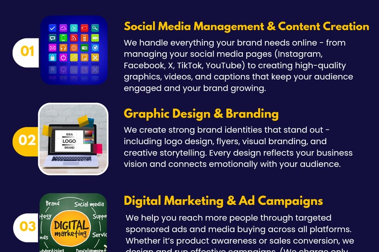 Our approach combines creativity and strategy to build strong brand presence, meaningful engagement, and sustainable growth for businesses and organizations.